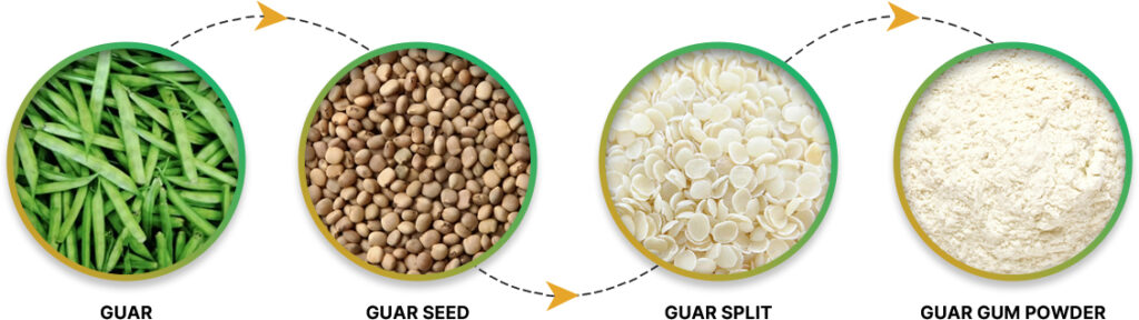 Guar Gum, also called guaran, is derived from endosperm of the guar plant (Cyamopsis tetragonolobus). Guar is a legume crop, which grows best in sandy soils and needs moderate, intermittent rainfall with lots of sunshine.